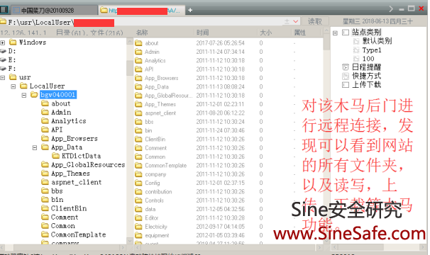后门文件,随即我们立即登录FTP,进行查看,确实发现有这么一个文件,对其人工安全审计
